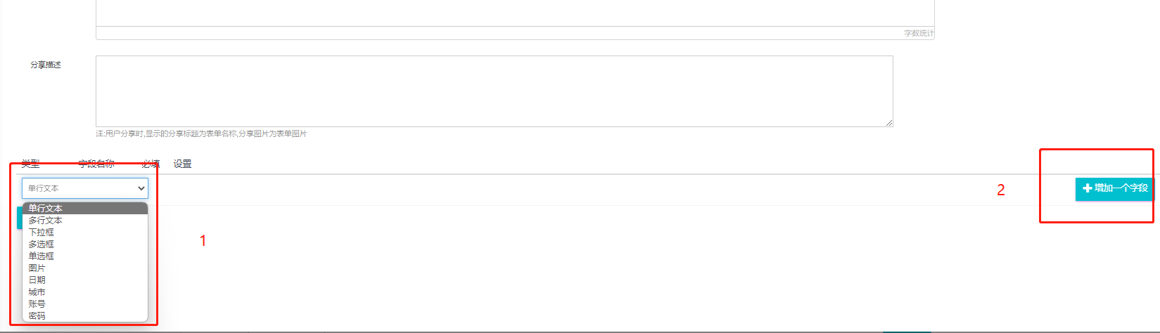 选中类型后点击添加字段,类型有:单行文本、多行文本、下拉框、多选框、单选框、图片、日期、城市、账号密码(账号密码是用于供应商申请表单使用时才会显示)。每个字段可以拖动互换位置。
